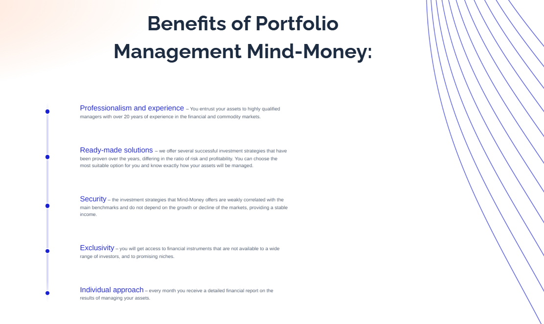 Mind Money — это платформа, выстроенная на принципах европейской надёжности, прозрачности и технологического комфорта. Она ориентирована на клиентов, которые ценят структуру, последовательность и уважение к индивидуальному подходу. Не обещая сверхдоходности, сервис предлагает чёткие, понятные инструменты для достижения инвестиционных целей.